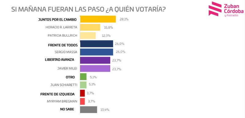La encuesta que acertó con los candidatos que competirán en las PASO es la de Zuban Córdoba y Asociados, encuestadora que a principio de junio puso a competir a Juntos por el Cambio en la interna, con Massa como candidato, Milei y Schiaretti por fuera.