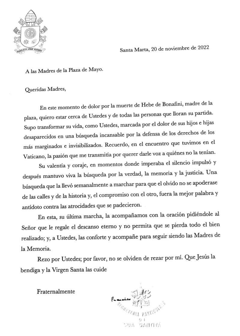 En este momento de dolor por la muerte de Hebe de Bonafini, madre de la plaza, quiero estar cerca de Ustedes y de todas las personas que lloran su partida. Supo transformar su vida, como Ustedes, marcada por el dolor de sus hijos e hijas desaparecidos en una búsqueda incansable por la defensa de los derechos de los más marginados e invisibilizados. Recuerdo, en el encuentro que tuvimos en el Vaticano, la pasión que me transmitía por querer darle voz a quiénes no la tenían. Su valentía y coraje, en momentos donde imperaba el silencio impulsó y después mantuvo viva la búsqueda por la verdad, la memoria y la justicia. Una búsqueda la llevó semanalmente a marchar para que el olvido no se apoderase de las calles y de la historia y, el compromiso con el otro, fuera la mejor palabra y antídoto contra las atrocidades que se padecieron.