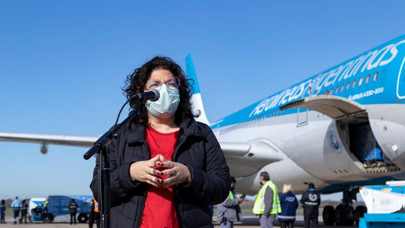 "No hay ninguna vacuna en la heladera", afirmó la ministra de Salud, Carla Vizzotti, en declaraciones a la prensa al llegar esta mañana al aeropuerto de Ezeiza, procedente de Rusia, junto con un cargamento de 650 mil vacunas Sputnik V -400 mil del componente 1 y 250 mil del 2- y 500 litros de sustancia activa, que es el granel para 750 mil dosis que van directamente al laboratorio Richmond.
