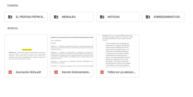 Finalizada la difusión de su discurso por Youtube, Fernández de Kirchner divulgó una carpeta virtual en el que se encuentran todos los archivos que utilizó en la presentación de hoy, vinculados en la "cercanía" del funcionario kirchnerista con empresarios ajenos a su círculo. La misma consta de cuatro carpetas secundarias y un conjunto de archivos individuales.