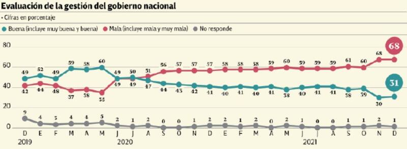 El resultado de ello es que se sostiene la máxima calificación negativa a la gestión desde la asunción de Fernández, con un impacto total en el votante de Juntos por el Cambio y que inclusive alcanza a un 14% de los encuestados que optaron por los candidatos del Frente de Todos apenas en noviembre pasado.