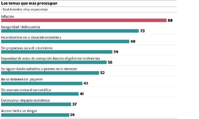 Adicionalmente, los participantes del estudio manifestaron preocupación por la impunidad de actos de corrupción del gobierno kirchnerista, el reparto de subsidios, la falta de freno a los piquetes y de avance en la lucha contra el narcotráfico, así como el impacto económico del coronavirus y el fácil acceso a la obtención y consumo de drogas.