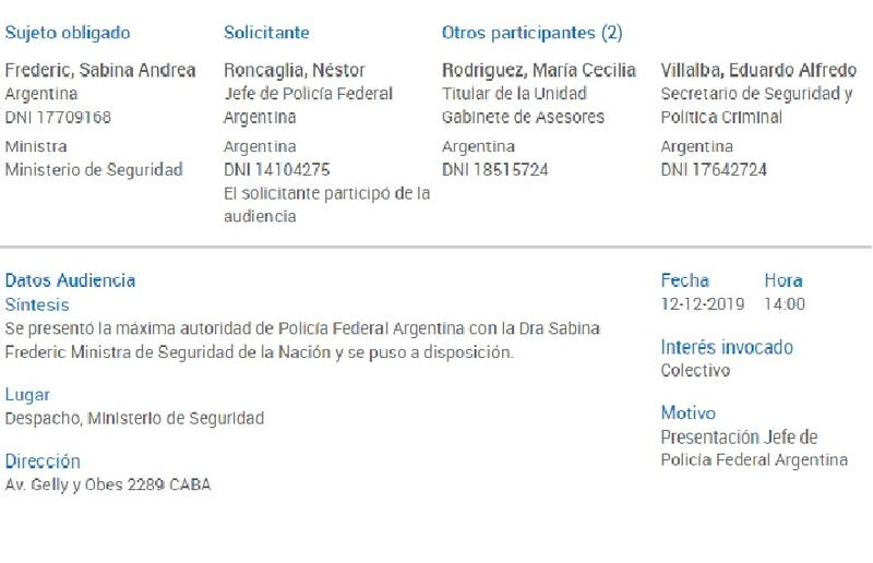 Caso parecido es el de la titular de Seguridad, Sabina Frederic, quien en diciembre completó las cinco reuniones que comunicó al registro oficial de audiencias. Todas las realizó en un mismo día, el 12 de ese mes, y los participantes fueron Alejandro Benedetti (Dirección Nacional de Fronteras), Néstor Roncaglia (jefe de la Policía Federal), Alejandro Itzcovich Griot (director Nacional de la Policía de Seguridad Aeroportuaria) y Eduardo Scarzello (prefecto Nacional Naval) y Gerardo Otero (Director Nacional de Gendarmería). Además, solicitó una audiencia ella misma, a una de sus asesoras, María Cecilia Rodríguez, ex ministra nacional.