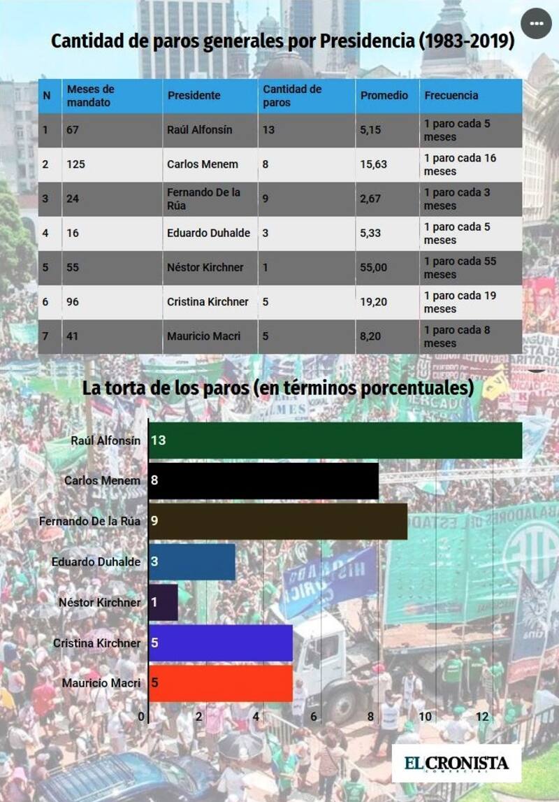Las cifras históricas muestran que la mayor cantidad de paros generales se registraron durante los dos gobiernos radicales. Raúl Alfonsín ocupa el primer lugar con 13 huelgas en su contra, mientras que el segundo es Fernando de la Rúa con 9 movilizaciones.