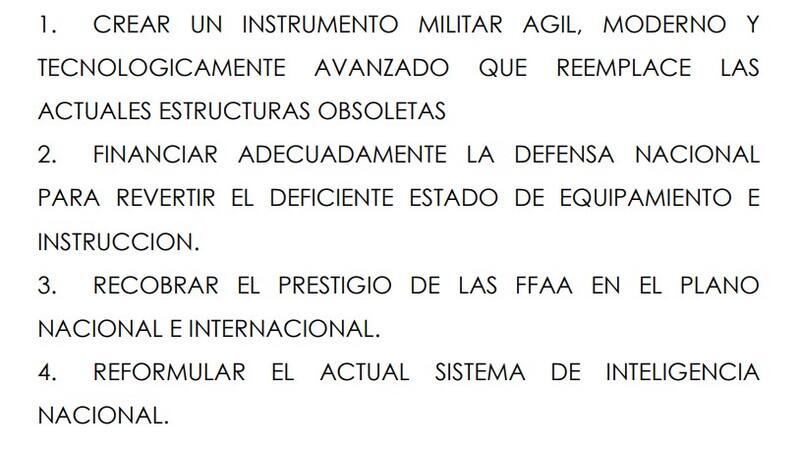 En la plataforma electoral presentada a la Cámara Nacional Electoral (CNE) y en su propio plan de gobierno, aparece como una de las prioridades la suba presupuestaria en Defensa para "crear un instrumento militar ágil, moderno y tecnológicamente avanzado". Aunque uno de los puntos más interesantes es uno de los apartados que apunta a "recobrar el prestigio de las FFAA en el plano nacional e internacional".