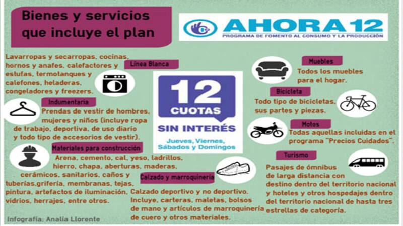 Según anunció la semana pasada la presidenta Cristina Kichner, el Plan “Ahora 12” permite comprar indumentaria, calzados y marroquinería, muebles, línea blanca, motos y bicicletas, materiales para la construcción y paquetes turísticos.