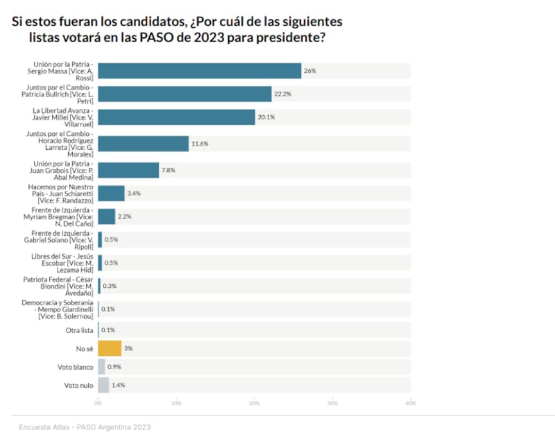 Atlas Intel se suma a la misma lectura que diversas encuestadoras: Sergio Massa aparece como el candidato individual más votado y Patricia Bullrich mantiene una ventaja significativa contra Horacio Rodríguez Larreta.