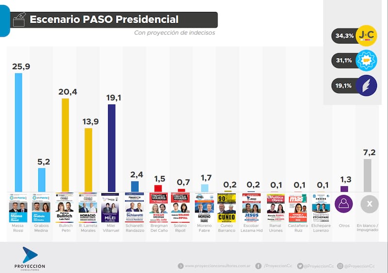 En el desagregado de internas, la fórmula Bullrich-Petri se impone en el estudio con un 20,4% y el binomio Larreta-Morales obtendría un 13,9%. En tanto, la boleta de Massa-Rossi tendría un 25,9% de votos mientras que la fórmula rival de Grabois-Abal Medina tendría un 5,2%.
