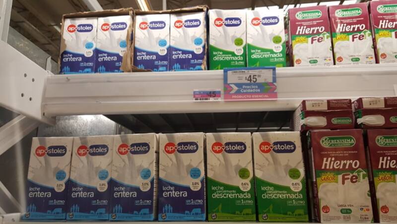 Lácteos: con los $ 2000 se puede comprar hasta 44 litros de leche de la marca Apóstoles ($ 45 cada cartón) que figura dentro de la lista de precios esenciales.