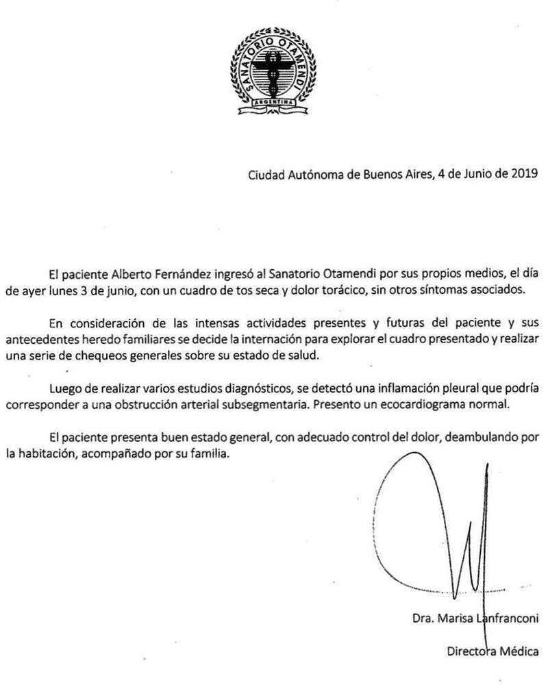 - El paciente Alberto Fernández ingresó al Sanatorio Otamendi por sus propios medios, el día de ayer, lunes 3 de junio, con un cuadro de tos seca y dolor torácico, sin otros síntomas asociados.