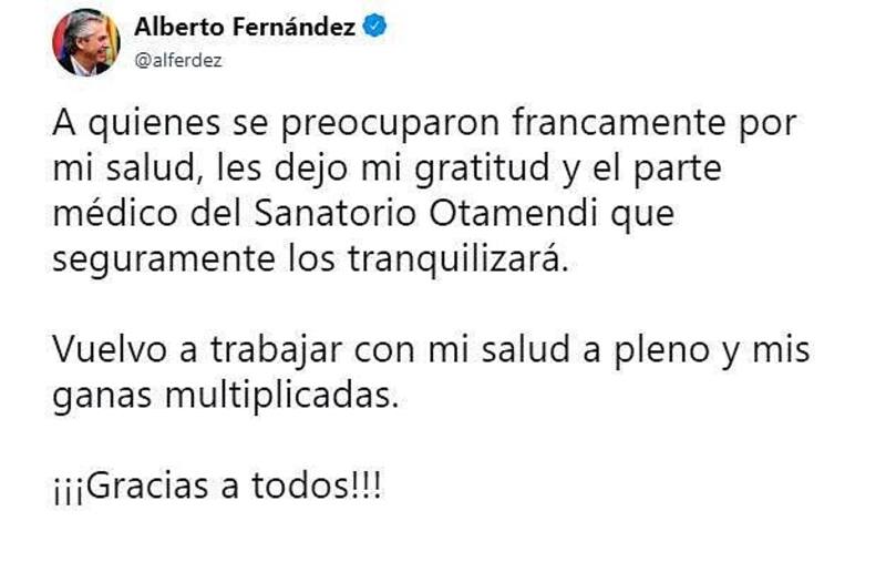 Por su parte, Fernández emitió un mensaje en su cuenta de Twitter dirigido "a quienes se preocuparon francamente por mi salud".