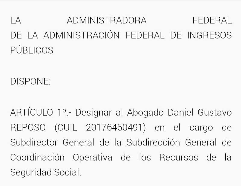 Esta mañana, se oficializó en el Boletín Oficial el nombramiento de Daniel Reposo en la Administración Federal de Ingresos Públicos. Tendrá el cargo de subdirector General de la Subdirección General de Coordinación Operativa de los Recursos de la Seguridad Social.