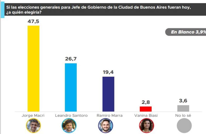 Ante la pregunta de si las elecciones generales para jefe de Gobierno de la Ciudad de Buenos Aires fueran hoy, el 47,5% eligió al candidato de Juntos por el Cambio. En segundo lugar, se posicionó Santoro, con el 26,7% y le siguió Marra, más alejado, con un 19,4%.