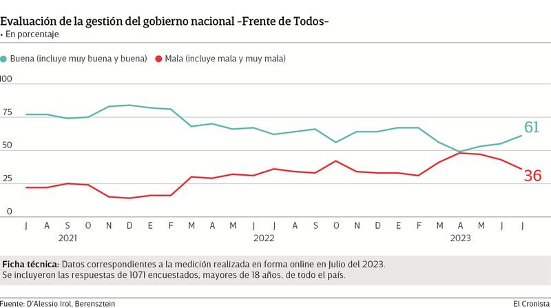 "En esta nueva medición se afianza la tendencia de los últimos meses, entre los cuales va mejorando la percepción de situación económica, tanto actual como futura", remarca, al respecto, el consultor Eduardo D'Alessio y agrega que "esto está trayendo aparejado una mejor imagen de la gestión de gobierno por tercer mes consecutivo entre los votantes del Frente de Todos".