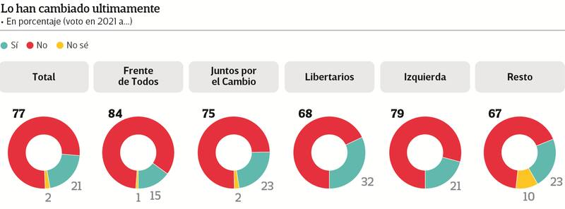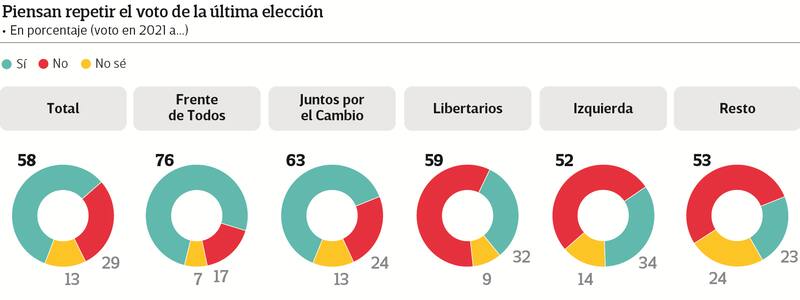 En cambio, un 29% aseguró que no lo hará y un 13% aún se mantiene indeciso. Entre quienes ya decidieron que no repetirán el voto, se destacan seis de cada diez electores de fuerzas libertarias en 2021 y un 52% de quienes optaron por la izquierda. Pero también, uno de cada cuatro de los que optaron por candidatos de JxC y hasta un 17% de los que se inclinaron por el entonces oficialista Frente de Todos, además de 53% de los que habían elegido listas de otros partidos.