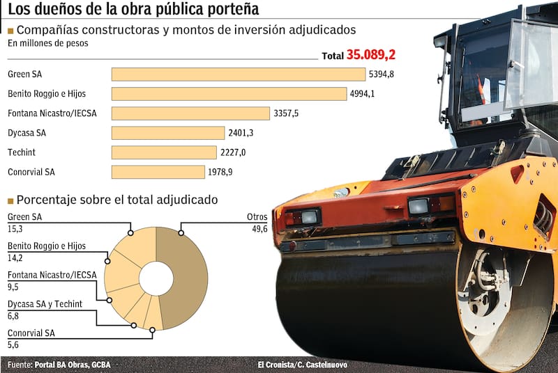 La primera constructora, en términos dinerarios, es Green S.A. La firma de Carlos Arroyo y Carlos Amprino, surgida en Mendoza, tiene contratos por $ 5.394,8 millones, por la edificación del Tramo B del Paseo del Bajo (en UTE con Seosa, por $ 1640,5 millones), el sector 3 y la etapa 6 del barrio Papa Francisco ($ 655 millones), y el viaducto del ferrocarril San Martín, entre La Paternal y Palermo ($ 3.098,8 millones, en UTE con Rottio).