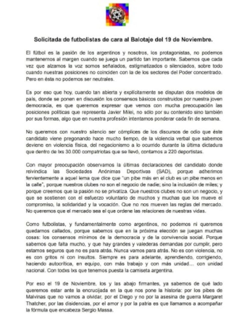 Decenas de futbolistas, vigentes y retirados, emitieron una solicitada en apoyo a la candidatura presidencial de Sergio Massa(Unión por la Patria), quienes, además, expresaron su preocupación por la reivindicación por parte del postulante Javier Milei (La Libertad Avanza) sobre las Sociedades Anónimas Deportivas (SAD), la cual permite la privatización de la gestión de los clubes que lo deseen.