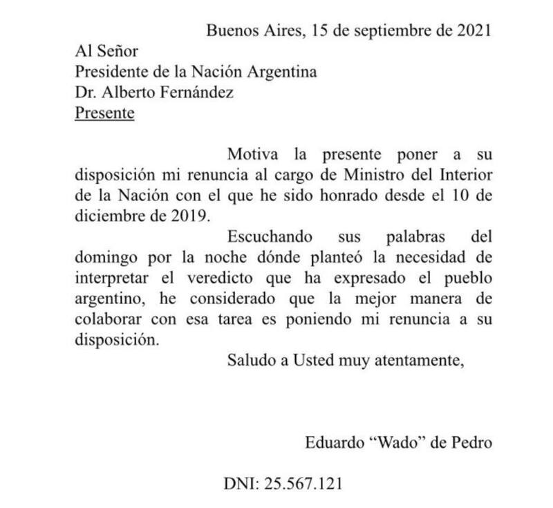 "Motiva la presente poner a su disposición mi renuncia al cargo de Ministro del Interior de la Nación con el que he sido honrado desde el 10 de diciembre de 2019", apunta la carta de dimisión que elevó de Pedro al presidente Alberto Fernández. "Escuchando sus palabras del domingo por la noche dónde planteó la necesidad de interpretar el veredicto que ha expresado el pueblo argentino, he considerado que la mejor manera de colaborar con esa tarea es poniendo mi renuncia a su disposición", continúa el texto.