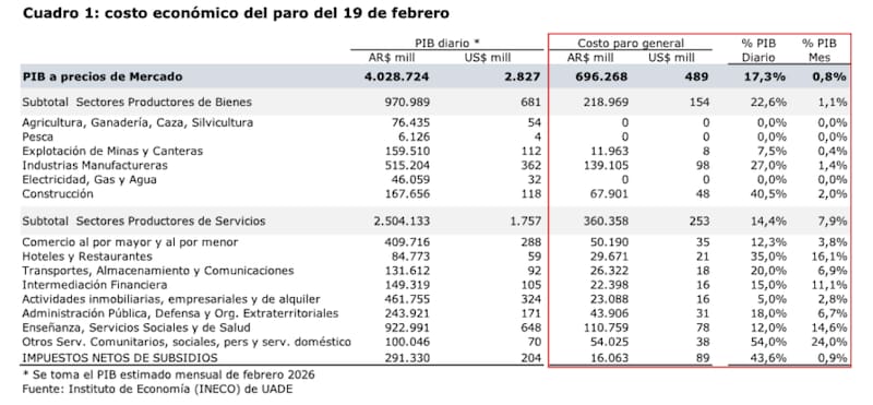 Según el informe detallado del Instituto de Economía de la UADE (INECO), el costo de paralizar el país durante 24 horas asciende a $696.268 millones, lo que representa el 20,3% de lo que se hubiera producido en un día normal y el 0,8% del PIB mensual de febrero.