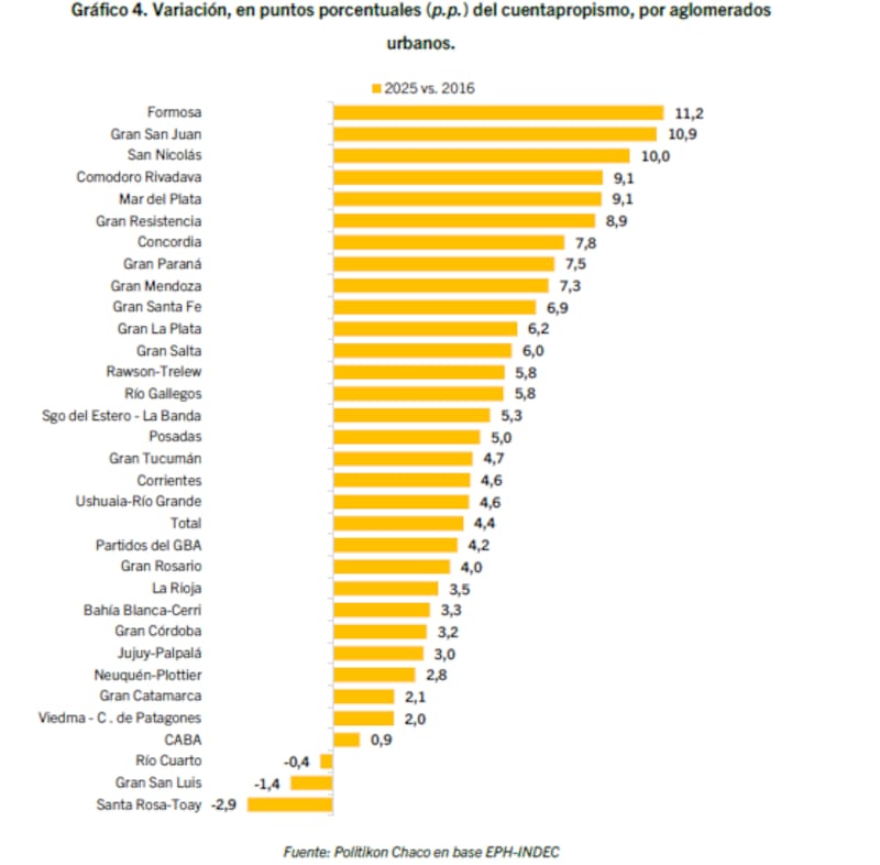 En el extremo opuesto, las ciudades con menor peso del cuentapropismo son Ushuaia y Río Grande, donde apenas alcanza el 13,4%, seguida por Río Gallegos con el 14,2% y Viedma y Patagones con el 18,2%. En estos casos, el empleo asalariado, muchas veces vinculado al sector público o a actividades formales, sigue siendo predominante.