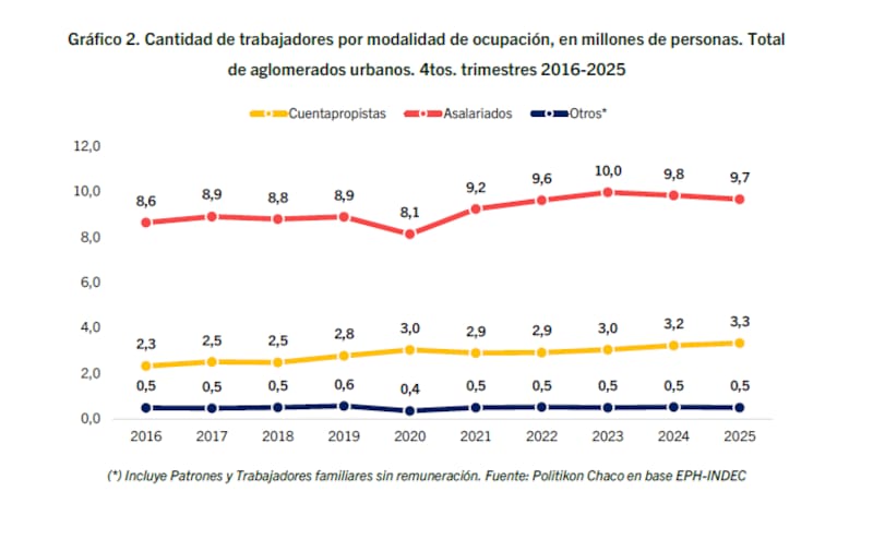 Según el último informe de Politikón Chaco, sobre un total de 13,5 millones de ocupados en los aglomerados urbanos, el 71,5% son asalariados y el 24,7% trabajan por cuenta propia.
