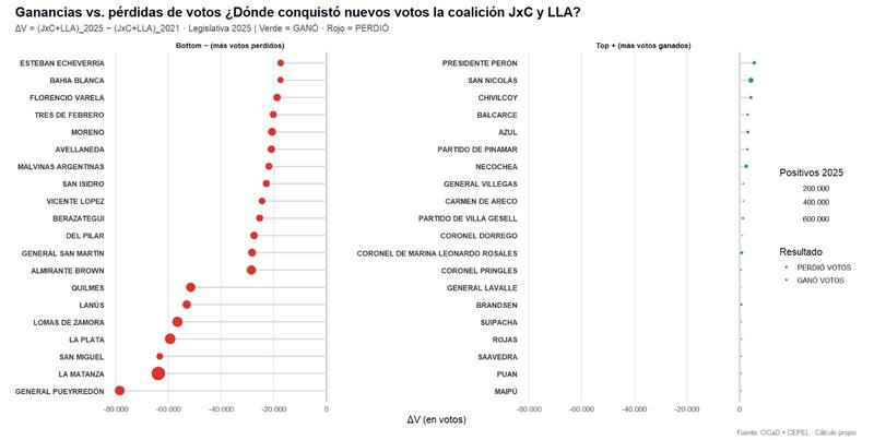 Hubo 37 municipios donde FP perdió votos y también cayó en porcentaje, siendo Tigre y San Miguel los casos más resonantes. En Tigre, la boleta encabezada por Gabriel Katopodis logró imponerse en la sección, pero sufrió una merma de votos en la localidad, lo que obligará a repensar la estrategia de movilización para octubre.