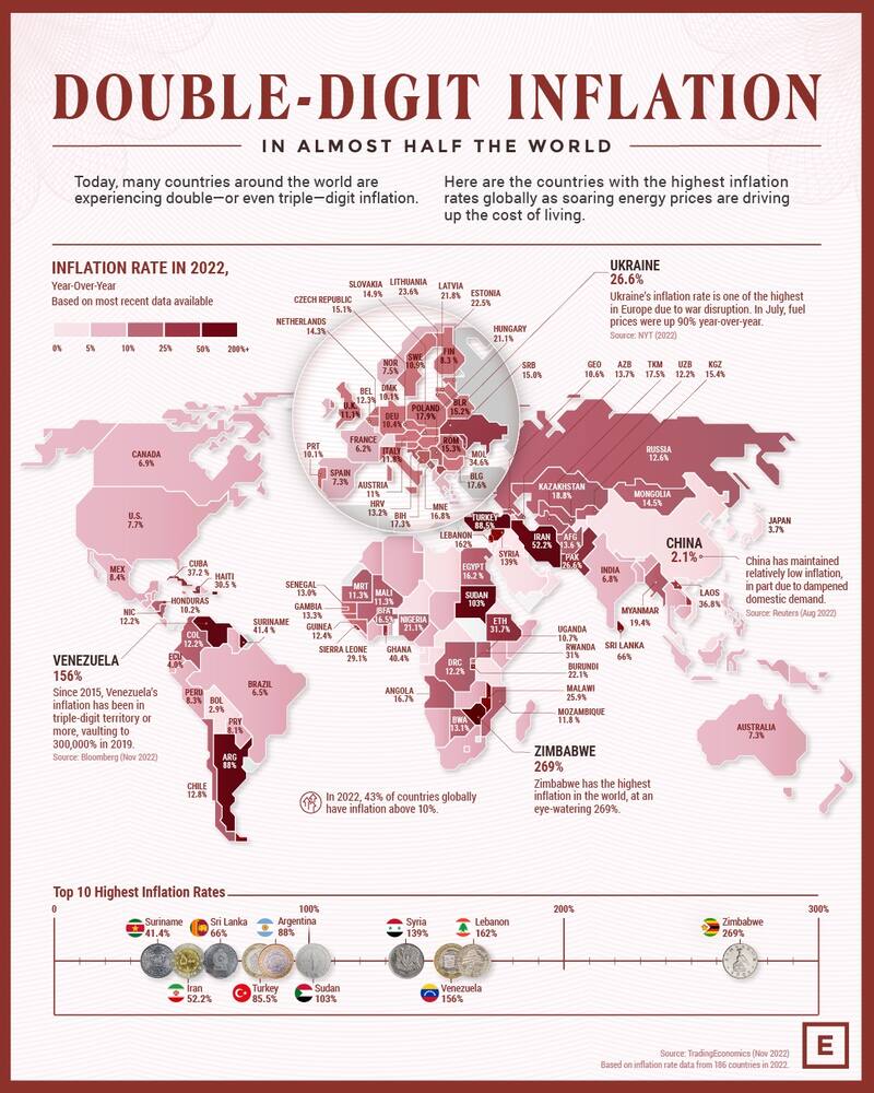Con el resultado de diciembre, el IPC de la Argentina para todo 2022 marcó 94,8%, el dato más alto desde 1991, y logró mantenerse fuera del top 5 que conforman Zimbabue, Líbano, Venezuela, Siria y Sudán, países con inflaciones de tres dígitos. El índice de precios de Zimbabue, el más alto del mundo, supera el 260% según la comparación de datos globales -con mediciones a octubre- de Trading Economics que grafica Visual Capitalist.
