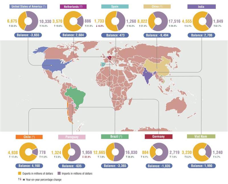 Luego se destacan novedades como India u$s 2706 millones; Países Bajos u$s 2684 millones y Vietnam u$s 1990 millones todas economías demandantes de manufacturas de la agroindustria, principalmente.