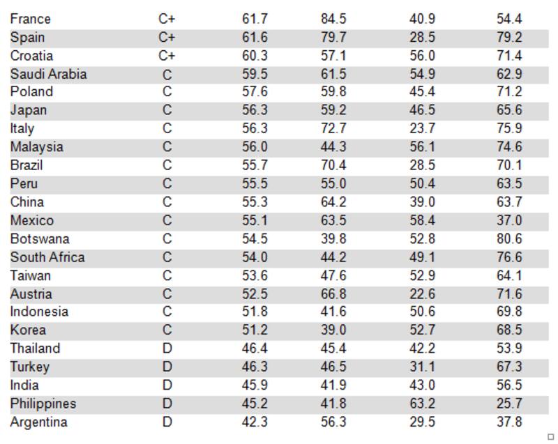 El índice elaborado por Mercer y el Instituto CFA, que compara a 47 países, ubico a la Argentina en el último puesto del ranking, con una calificación "D", lo que implica que, a pesar de tener características deseables como el nivel de cobertura, hay deficiencias u omisiones que deben subsanarse.