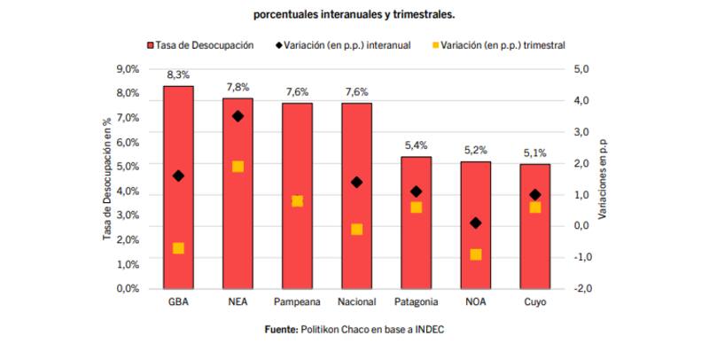 "En la comparación trimestral, puede verse algunas mejoras: en el NOA (-0,9 p.p.) y en el GBA (-0,7 p.p.) se redujo la tasa de desocupación, aunque en el resto de las regiones ésta tuvo una expansión siendo la del NEA, nuevamente, la más importante (+1,9 p.p.)", concluyeron.