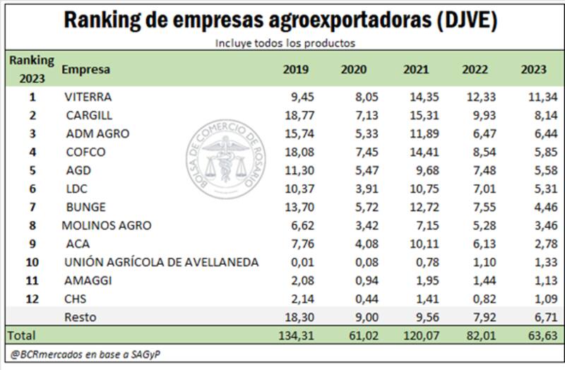 En tanto que Cargil, perdió 1,79 Mt al exportar 8,14 Mt en 2023 frente a las 9,93 que despachó el año anterior, mientras que ADM Agro ascendió del séptimo al tercer puesto con un nivel sostenido de operaciones en torno a los 6,4 Mt.