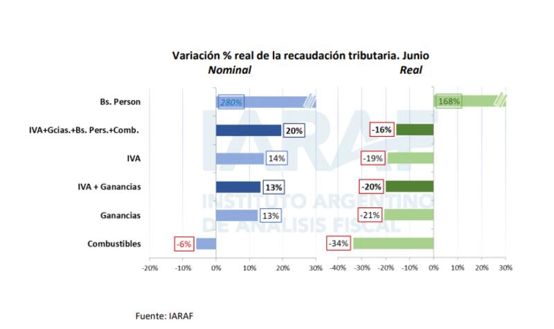 No obstante, la caída fue amortiguada por la existencia de tres días hábiles más que junio del año pasado, resaltó el Instituto Argentino de Análisis Fiscal (Iaraf), que en su monitoreo mensual registró un incremento de 20% en la recaudación de IVA, Ganancias, Bienes Personales e impuestos a los combustibles.