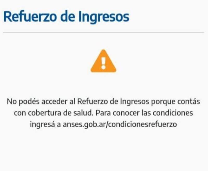 "No podés acceder al Refuerzo de Ingresos porque contas con cobertura de salud. Para conocer las condiciones ingresá a anses.gob.ar/condicionesrefuerzo", señala una de las dos leyendas que se reiteraron en los canales de consulta oficial.