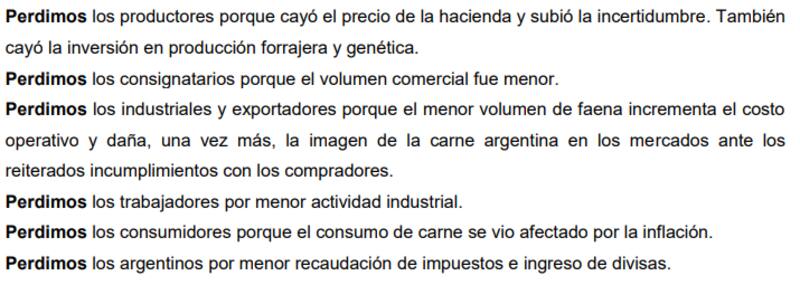 "Perdimos todos" se tituló el documento que firmaron productores, consignatarios, industriales y exportadores de la cadena de carne vacuna en el encuentro de este mediodía en el que se le pidió al Gobierno finalizar el cierre de exportaciones de carne vacuna.