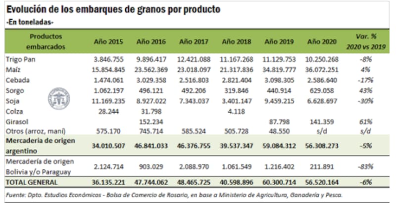Los únicos dos cultivos que crecieron durante 2020 fueron el maíz con el volumen de exportaciones más alto de la historia: 36 millones de toneladas embarcadas, un aumento del 4% y la representación del 64% de los despachos totales y, por otro lado, el sorgo con un incremento del 43%, si se realiza la comparación interanual.