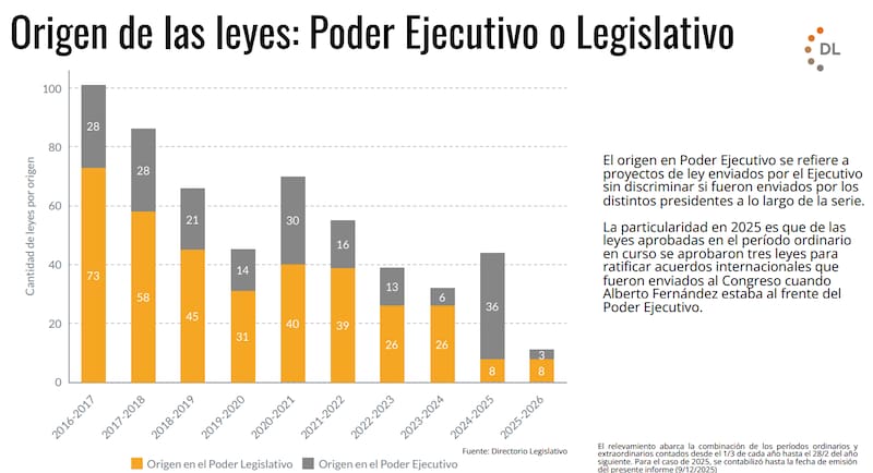 De las 11 normas aprobadas, todas las iniciativas de origen legislativo provinieron de la oposición, mientras que las únicas con origen en el Poder Ejecutivo fueron tres acuerdos internacionales enviados durante la presidencia de Alberto Fernández, que quedaron pendientes y fueron ratificados recién este año.