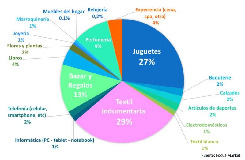 Según un informe de la Asociación Argentina de Marcas y Franquicias (AAMF), el 29% de las compras de regalos navideños serán en el rubro indumentaria, el 27% será en el de juguetes, el 13% de Hogar y Bazar, y el 9% en perfumerías.