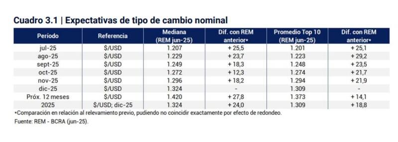 Para diciembre de 2025, en tanto, el conjunto de participantes pronostica un tipo de cambio nominal de $1.324/USD, lo que arroja una variación interanual esperada de 29,7% (+2,4 p.p. respecto del REM previo).