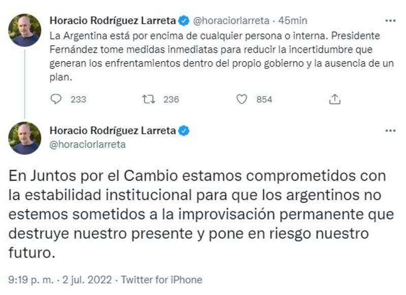 El jefe de Gobierno porteño, Horacio Rodríguez Larreta, también se pronunció tras la renuncia de Martín Guzmán y le pidió al Presidente "medidas inmediatas para reducir la incertidumbre que generan los enfrentamientos dentro del propio gobierno".