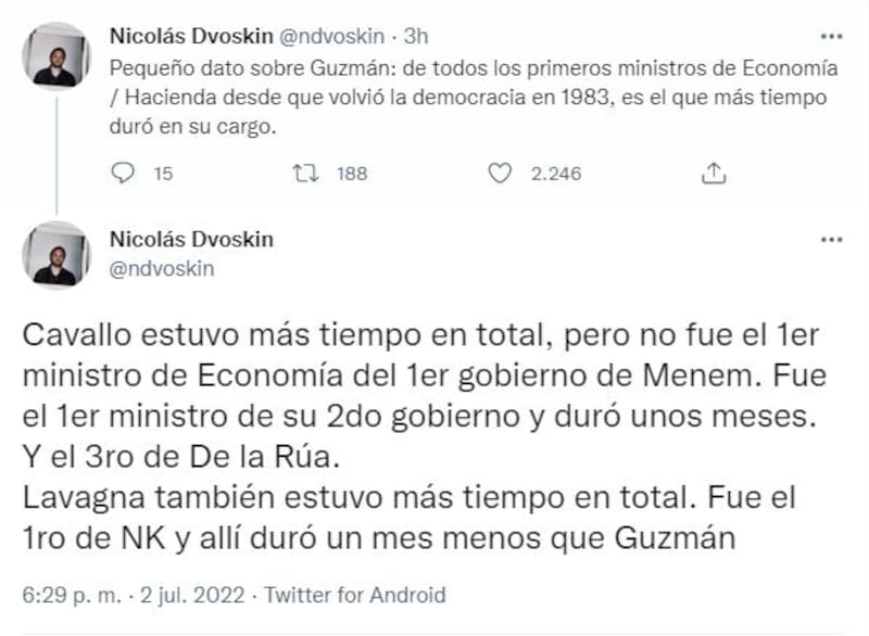 Guzmán fue ministro durante 30 meses, es decir, 935 días. Eso lo ubica en el sexto lugar en términos de duración entre los que más estuvieron al frente del Palacio de Hacienda desde la vuelta de la democracia a la Argentina en 1983.