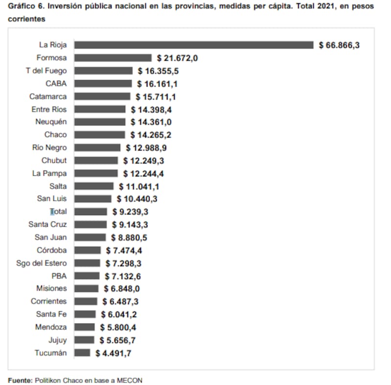 Por caso, La Rioja constituye "un caso único". Esto responde a que la inversión pública (particularmente, por el alto volumen de transferencias de capital, explicadas por la asignación presupuestaria que tiene en formato de compensación) equivalió en 2021 a $66.866,3 por riojano.