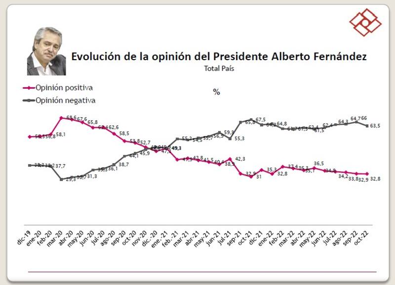 Por ejemplo, el presidente Alberto Fernández muestra una leve recuperación en cuanto a las opiniones sobre su figura. Si bien es negativa para el 63% de los consultados, el mes pasado era 66%. Y la positiva se mantuvo estable en un 33%.