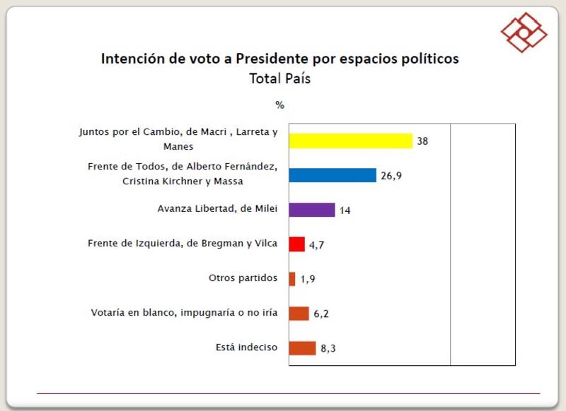 Sin embargo, cuando se elige un candidato por espacio los números se modifican. Por ejemplo, en el caso de que los candidatos fueran Horacio Rodríguez Larreta, Sergio Massa y Javier Milei, obtendrían 33, 23 y 13%, respectivamente.