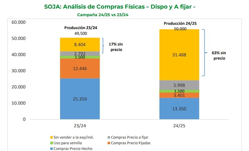 Según el Monitor Agroindustria de la Cámara de la Industria Aceitera (Ciara - CEC) el 63% de la cosecha de soja 24/25 por un volumen estimado en 31,488 millones toneladas, no tienen precio y están pendientes de vender por parte de los productores. En tanto, de la cosecha anterior 23/24 queda el 17 % sin vender (8,4 Mt).