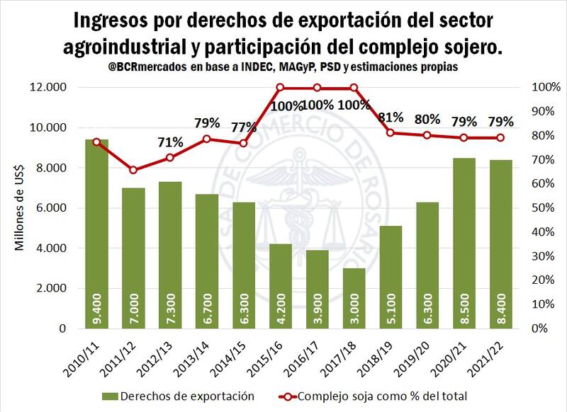 Según los datos de la Bolsa de Comercio de Rosario (BCR), el valor de la cosecha 2021/2022 será de u$s 37.500 millones, de los cuales el Estado recibirá en total un ingreso de u$s 8.400 millones. Parte de este monto ya fue recaudado porque por el sistema de pago anticipado de retenciones, los exportadores deben pagarlas cinco días después de anotar la Declaración Jurada de Venta al Exterior. Por ejemplo, en el caso del maíz ya se anotaron 22,5 millones de toneladas, cuando el saldo exportable es de 33,5 millones.