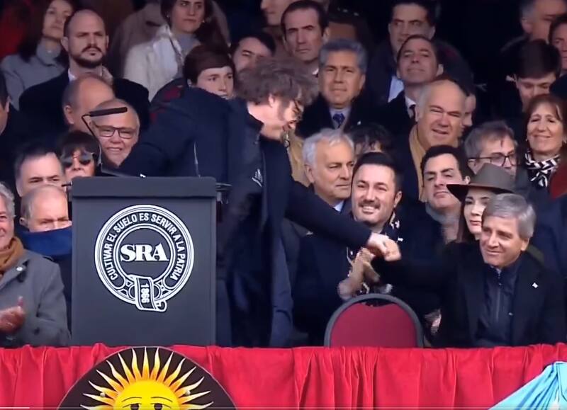 "Hace exactamente un año me paré prometiéndoles un cambio. En aquel entonces no nos alcanzaban las manos para enumerar los infinitos problemas que afectaban al campo argentino, veníamos de años de cepos, trabas burocráticas, aranceles asfixiantes, y nefastas y siniestras retenciones", recordó Milei.
