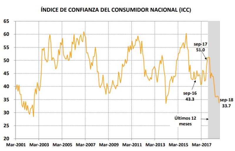 Las perspectivas de los consumidores reflejaron un derrumbe de 7% durante septiembre, en comparación al mes anterior, y la caída se profundiza hasta 34% en la medición contra el noveno mes de 2017, según el Índice de Confianza del Consumidor que mide la Universidad Torcuato Di Tella.