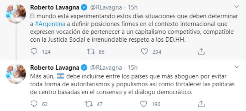 Mediante un breve hilo en su cuenta de Twitter, Lavagna le pidió al gobierno argentino condenar firmemente al régimen venezolano y ponerse del lado del "capitalismo competitivo" con una postura "irrenunciable respecto a los derechos humanos".