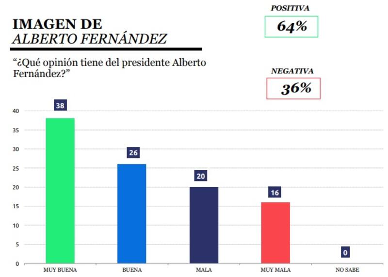 El segundo en el ranking (en empate técnico con Larreta si se tiene en cuenta el margen de error de la encuesta) es, como se dijo, el actual Presidente, que logra 64 puntos de imagen positiva (38% muy buena y 26% buena), 9 puntos más que en marzo, contra 36 puntos de imagen negativa (20% mala y 16% muy mala).
