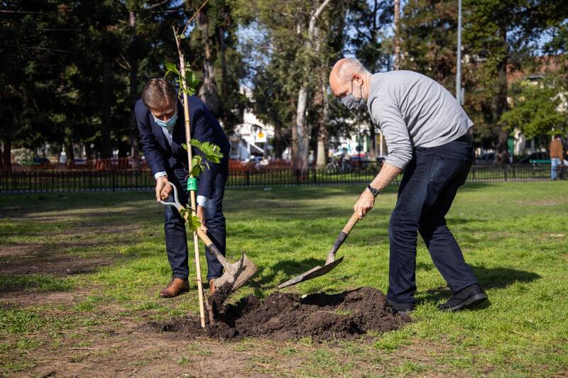 Horacio Rodríguez Larreta junto al gobernador de Mendoza de visita en Buenos Aires, Rodolfo Suárez, lanzaron el Distrito del Vino desde la Plaza Arenales, ubicada en el corazón de Villa Devoto. Junto a representantes de bodegas y comerciantes, los mandatarios recorrieron la zona y plantaron una vid.